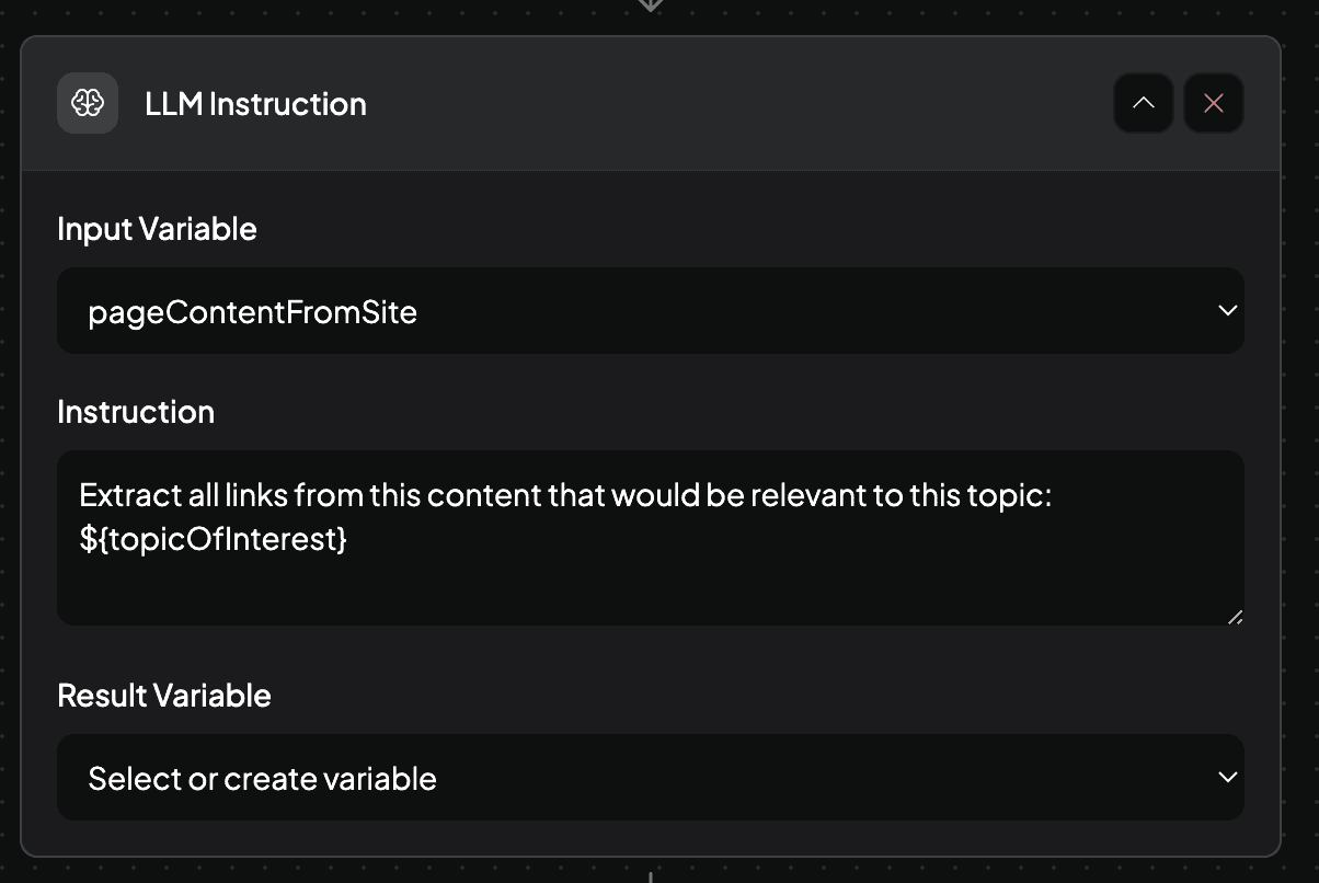 Instructions: The instructions to send to the LLM.Result Variable: The variable to store the result of the LLM.
