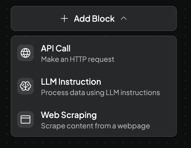 To add functionality to your flow, you'll need to add blocks. Click the "Add Block" button between any existing blocks to see available options: