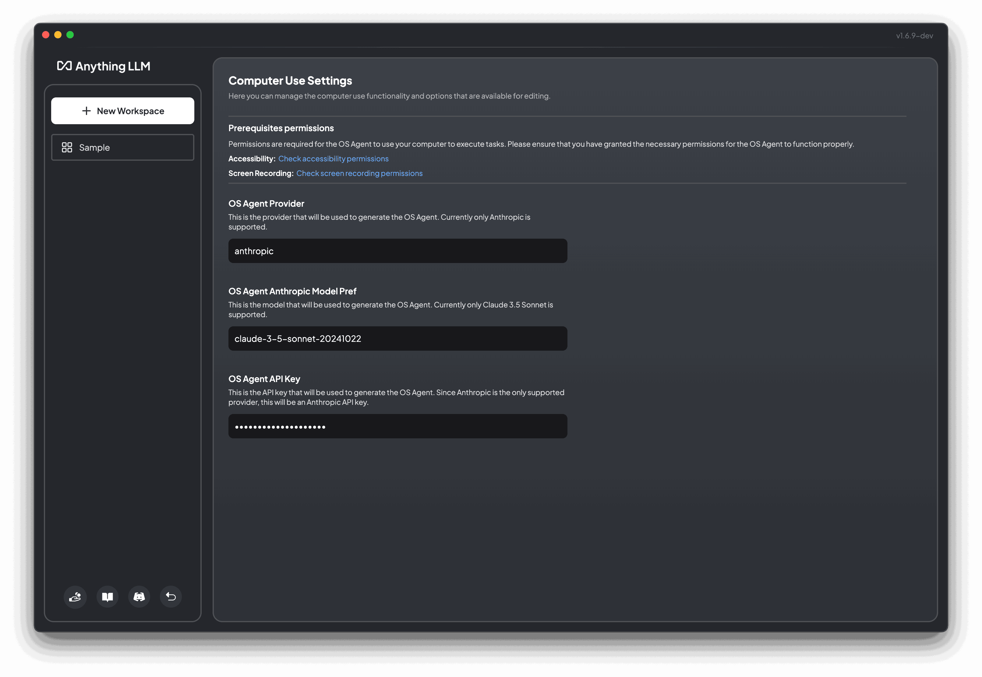 Note: The Anthropic model that enables computer use is fixed to claude-3-5-sonnet and cannot be changed. We also currently don't support BedRock or Vertex hosted providers.