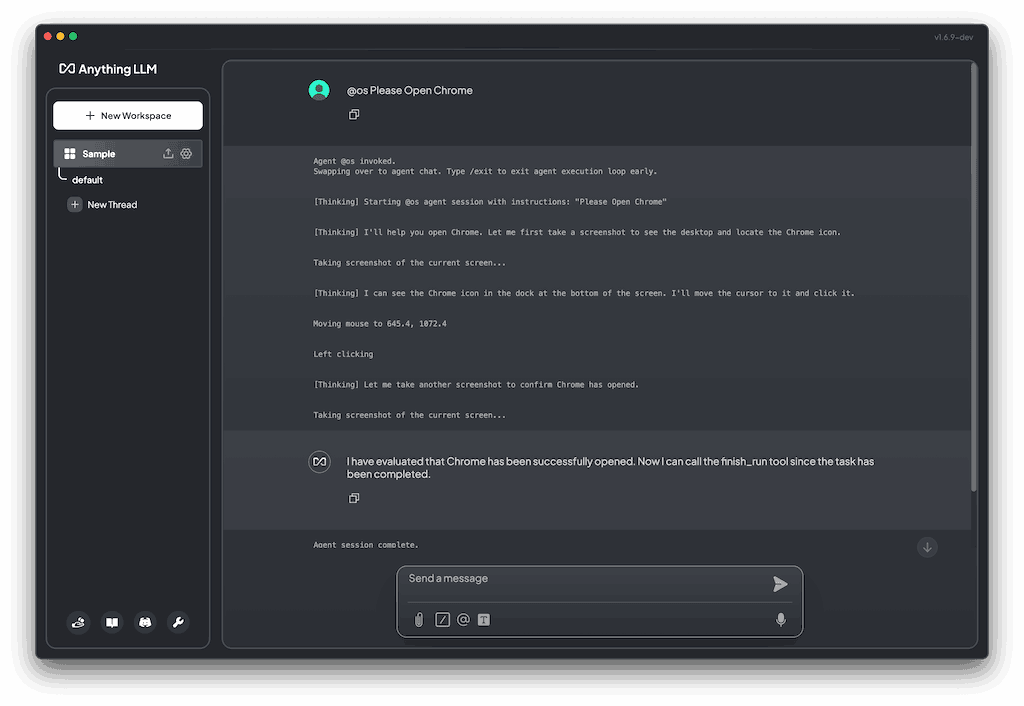 The OS agent will output its actions and any relevant information to the RealTimeX chat as it executes. These actions are currently not saved or stored your workspace's chat history.
