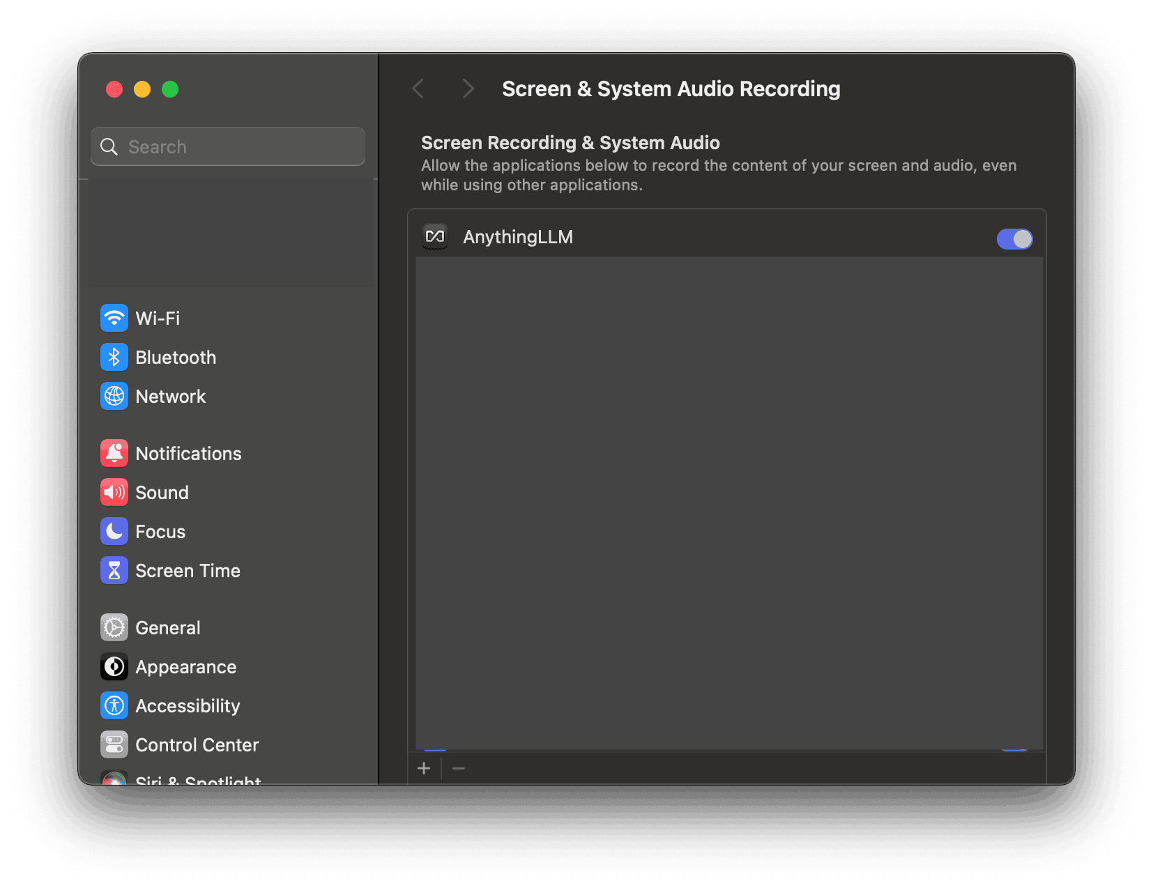 This is done by opening the Security & Privacy settings on MacOS and clicking on the Privacy tab. From there, find Screen Recording on the left and click on the + button to add RealTimeX.