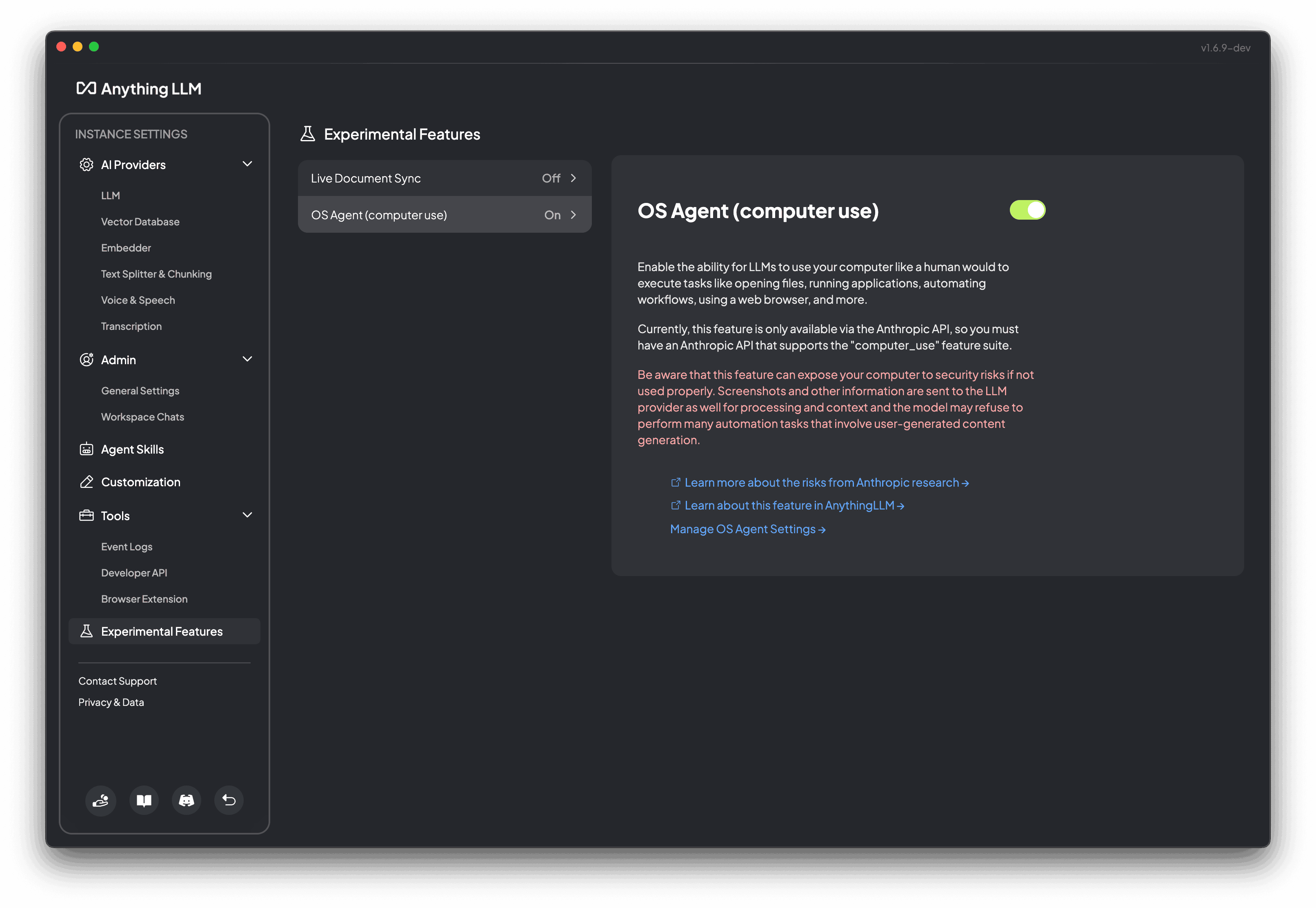 Before you can use the feature, you need to configure it with your Anthropic API key to be able to use the feature. Do this by clicking the Manage OS Agent Settings link in the feature preview management page.