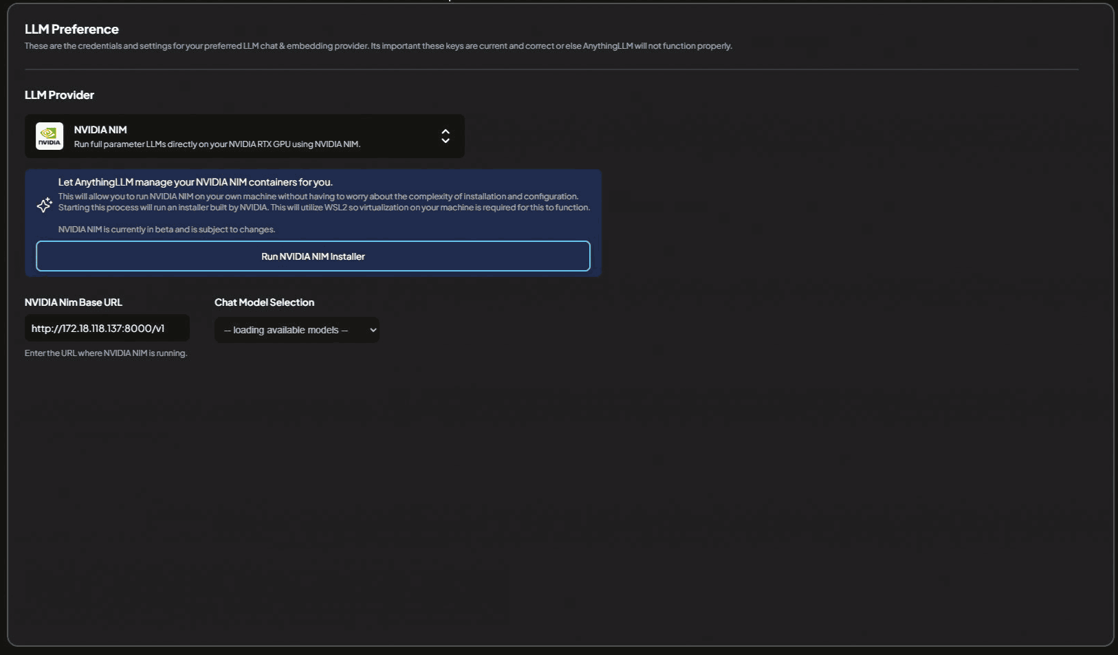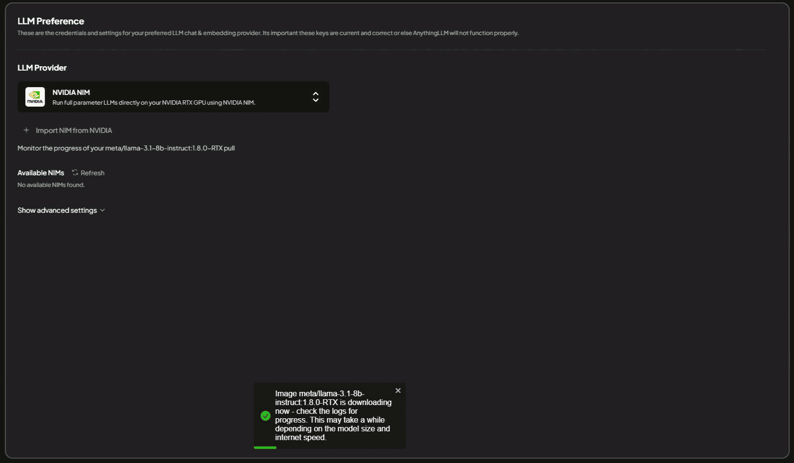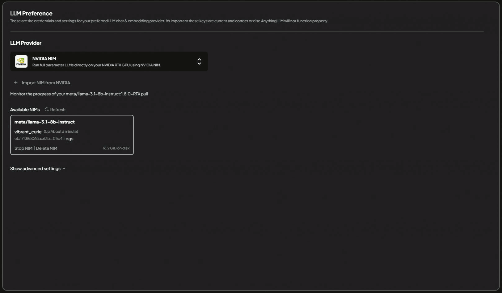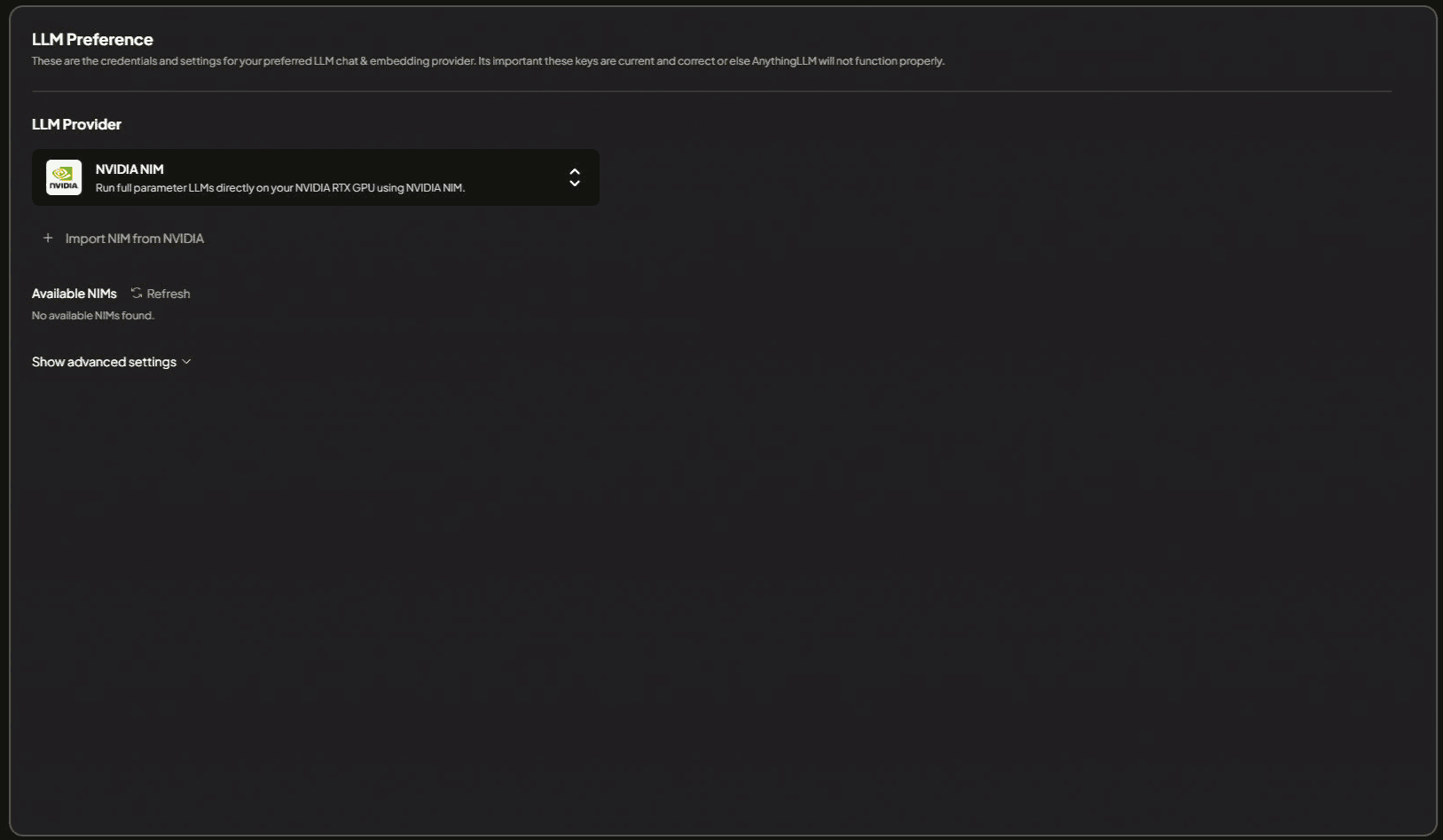 Select the NVIDIA NIM LLM Provider