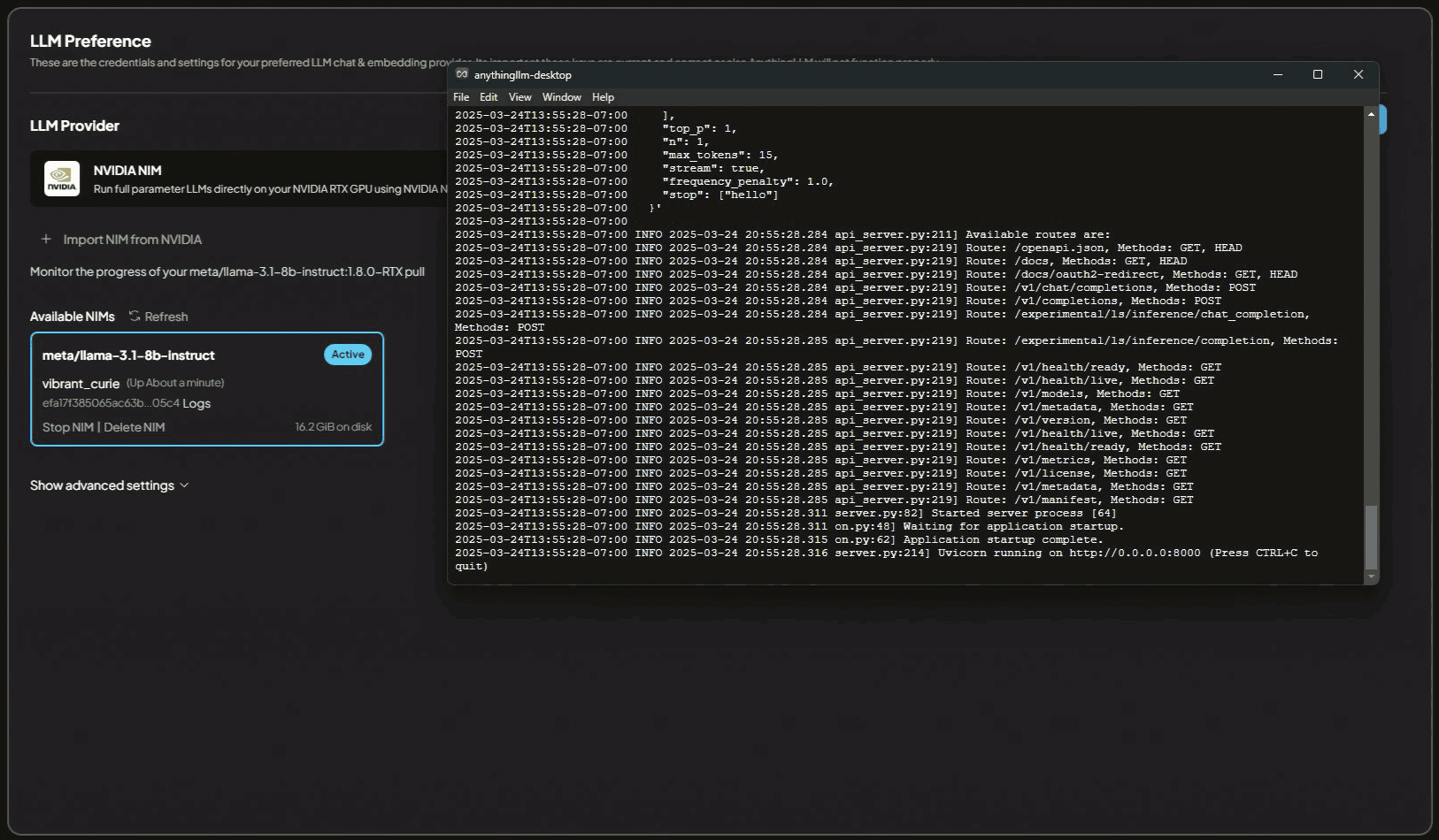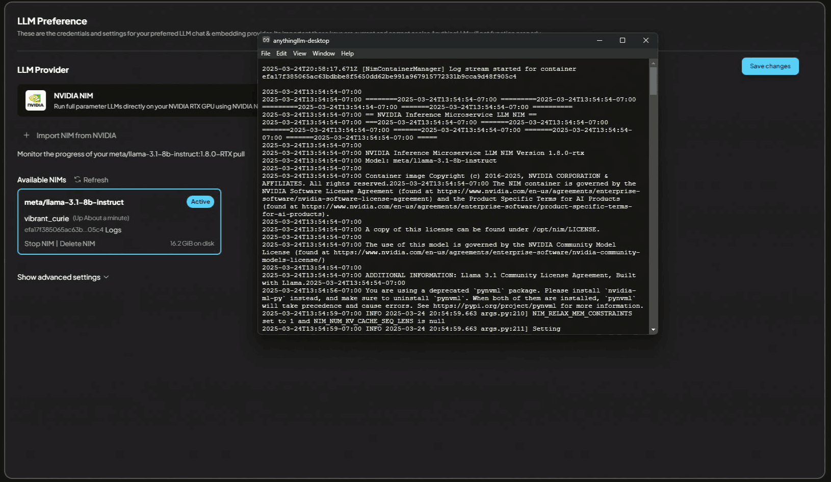 Streaming logs from the NIM