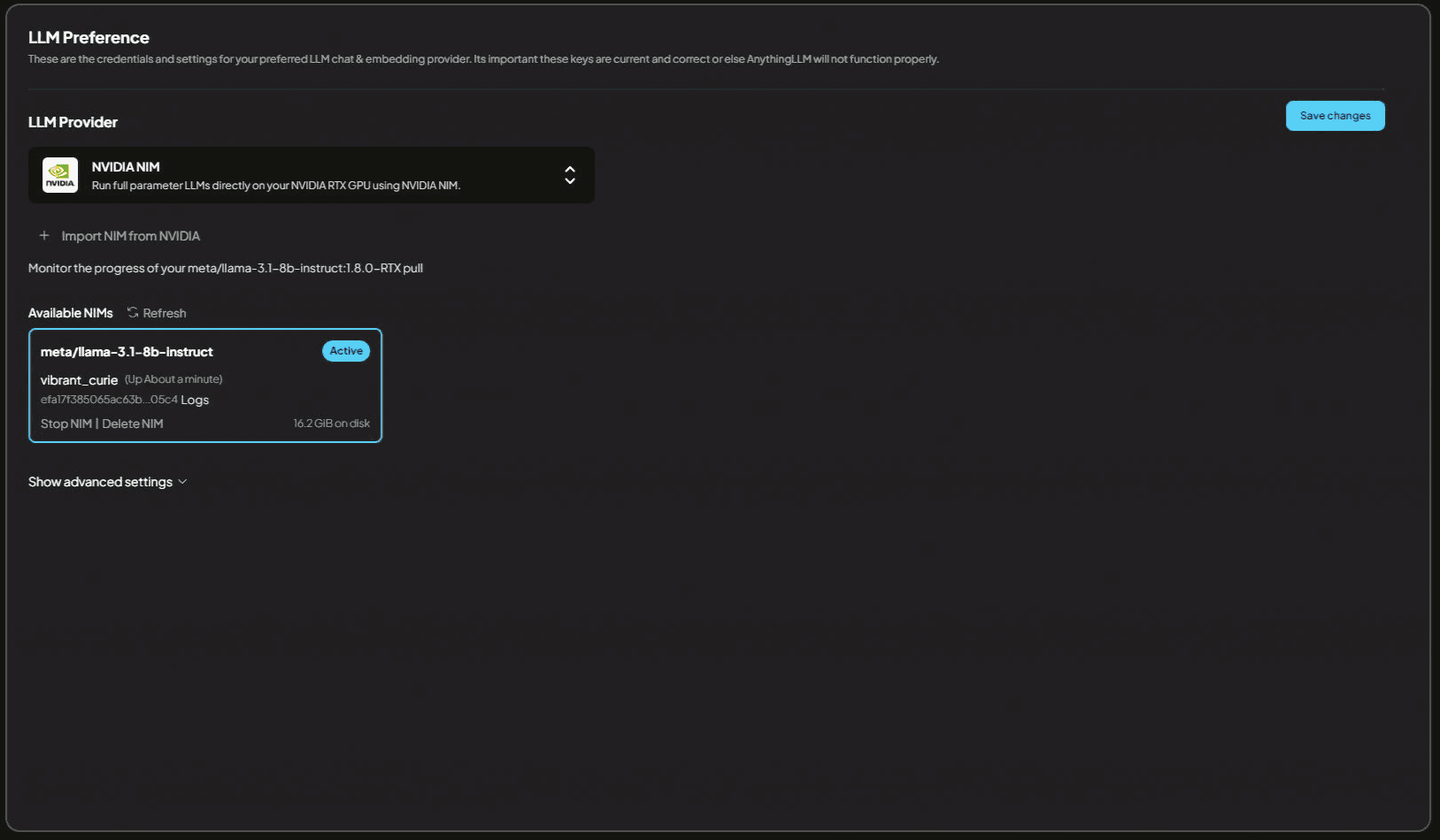 To select your NIM in RealTimeX, simply click on the model card for the NIM you want to use and click "Save changes" in the top right.