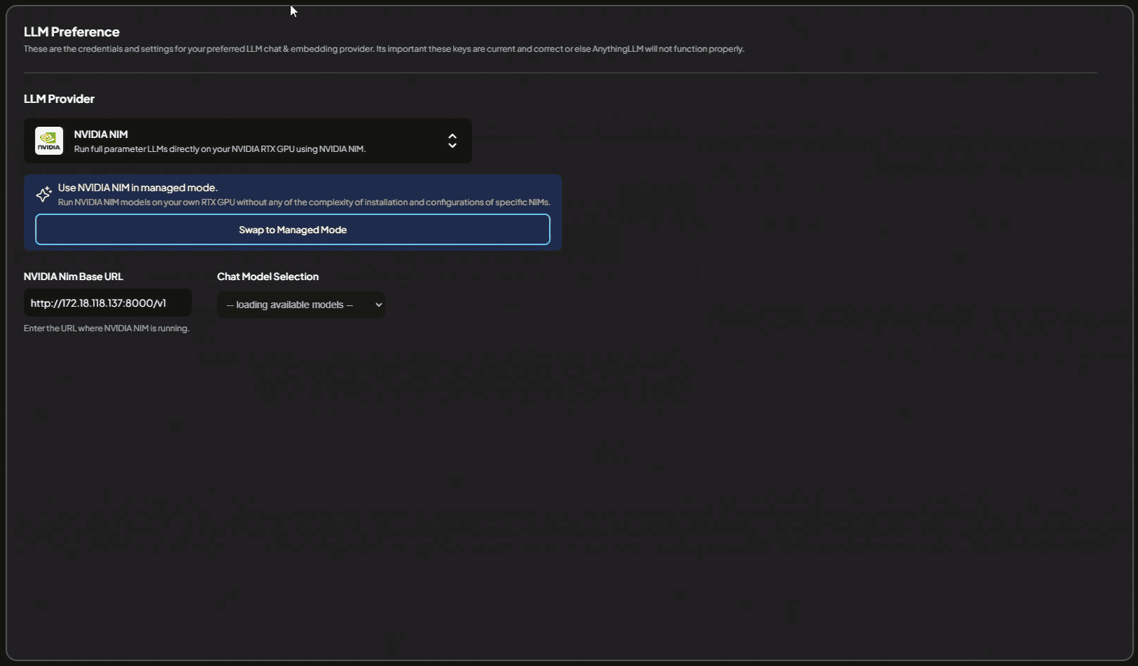 See Swap to Managed Mode for more information on how to use NVIDIA NIM in managed mode.